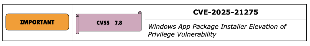 | CVE-2025-21275 | Important | Elevation of Privilege | 7.8 | Less Likely |