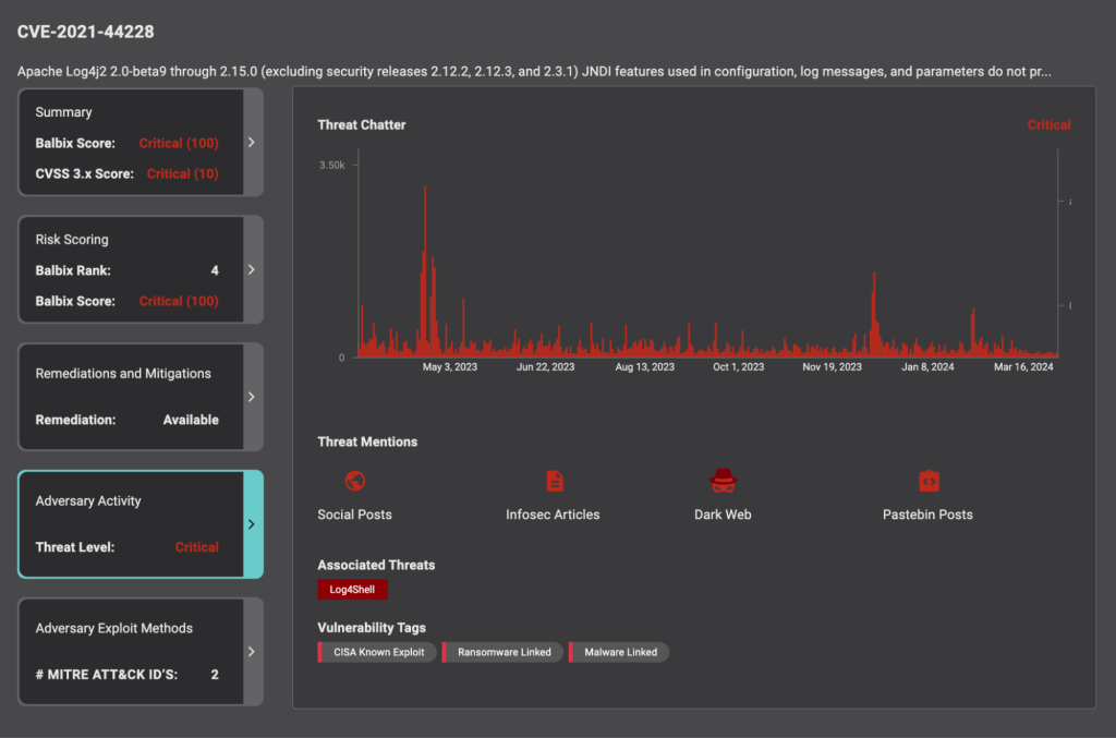 Balbix uses threat intelligence feeds, web scrapers, and other techniques for sourcing information on adversary activity, such as online chatter, discussions on the dark web and social media, and Pastebin posts. Balbix evaluates published exploit kits and known exploits using vulnerabilities. This ensures the likelihood of exploitation of vulnerabilities is much more accurate than with CVSS alone.